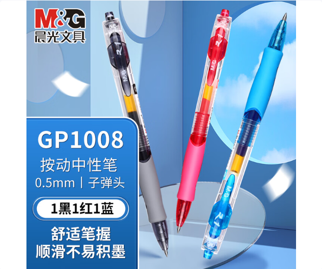 商品名称:晨光(M&G)中性笔创意者GP1008学生考试专用0.5子弹头水笔圆珠笔按压式签字笔商务办公简约经典【1黑1红1蓝】