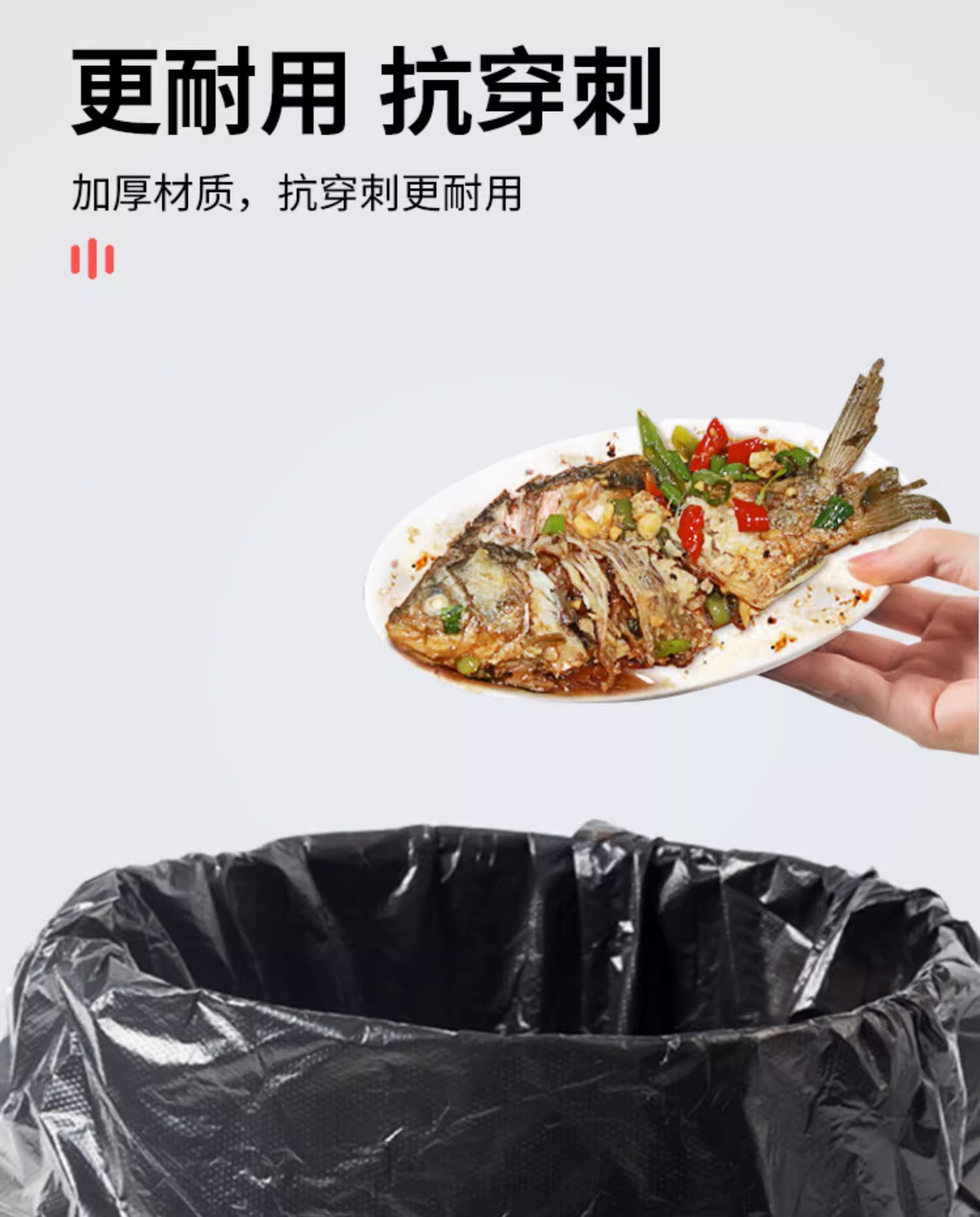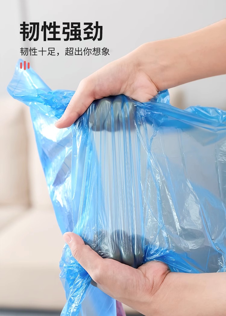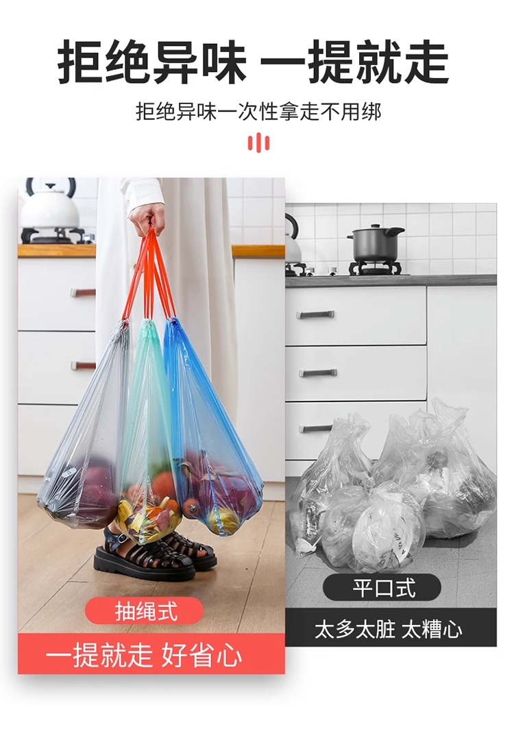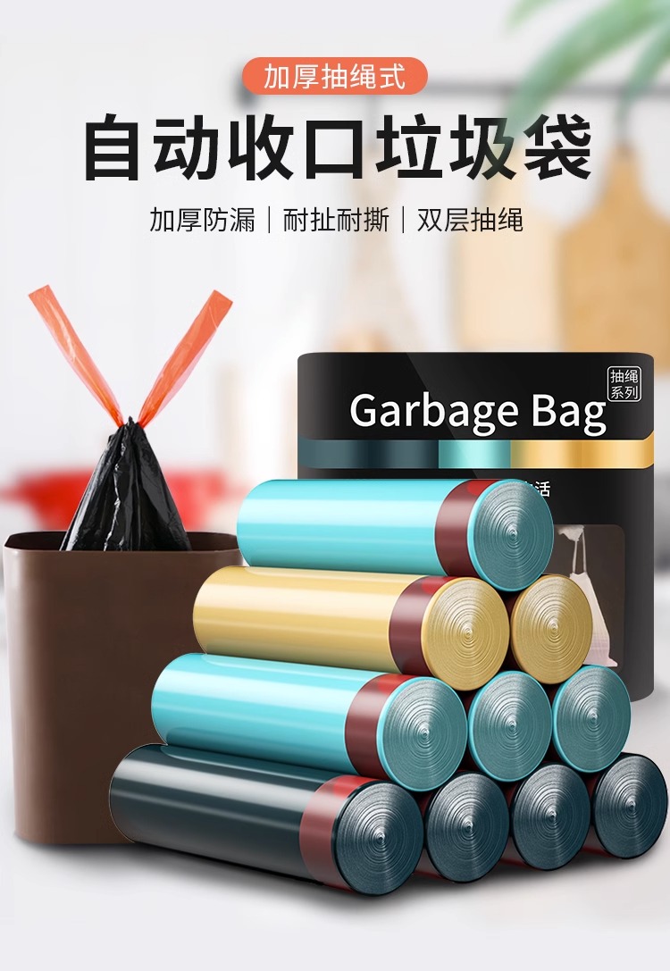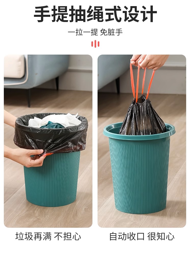 商品名称:抽绳收口垃圾袋家用手提式黑色加厚办公室厨房中大号实惠装塑料袋