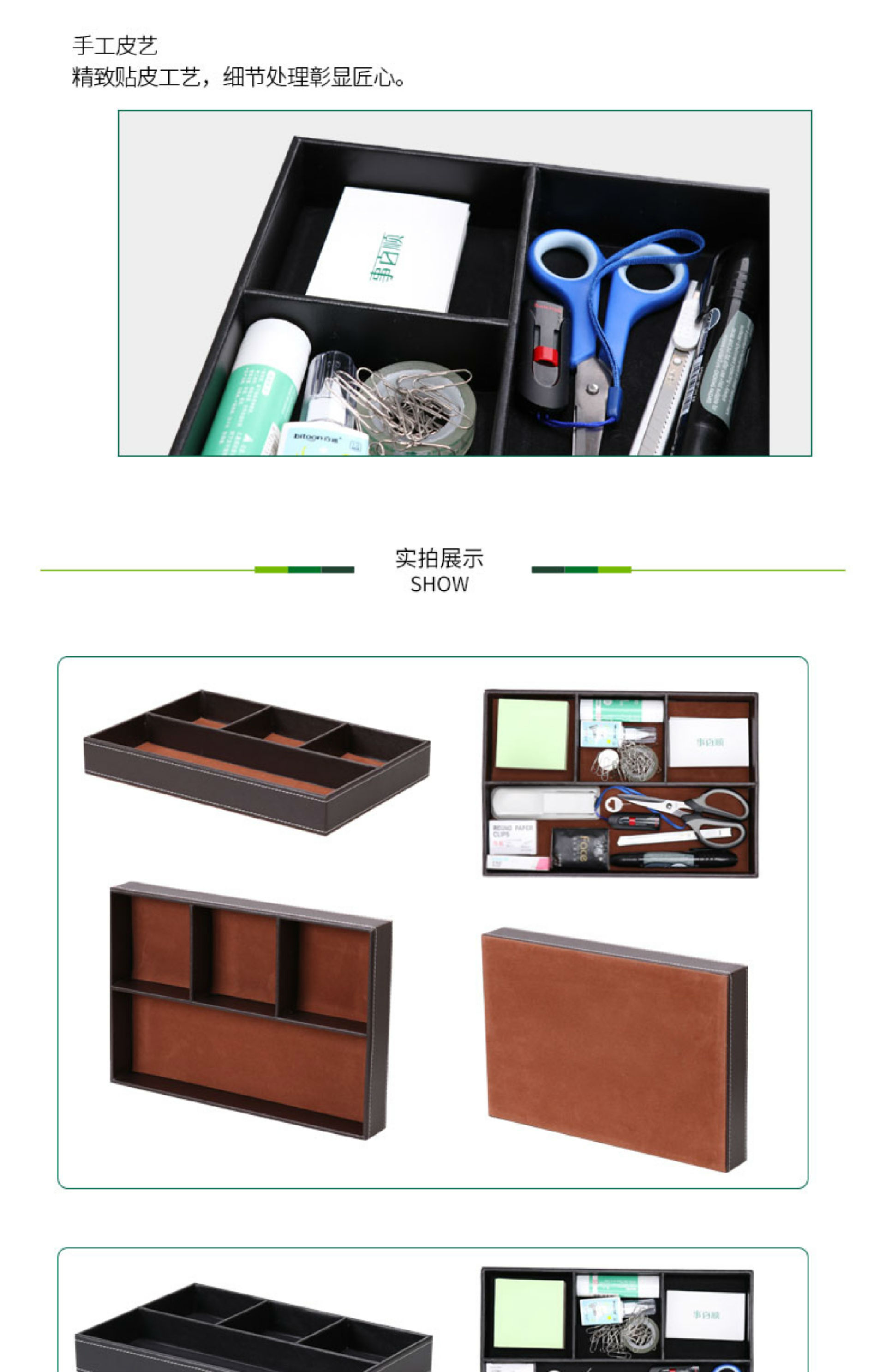 时尚皮革办公文具收纳盒盘创意木质桌面收纳整理多格